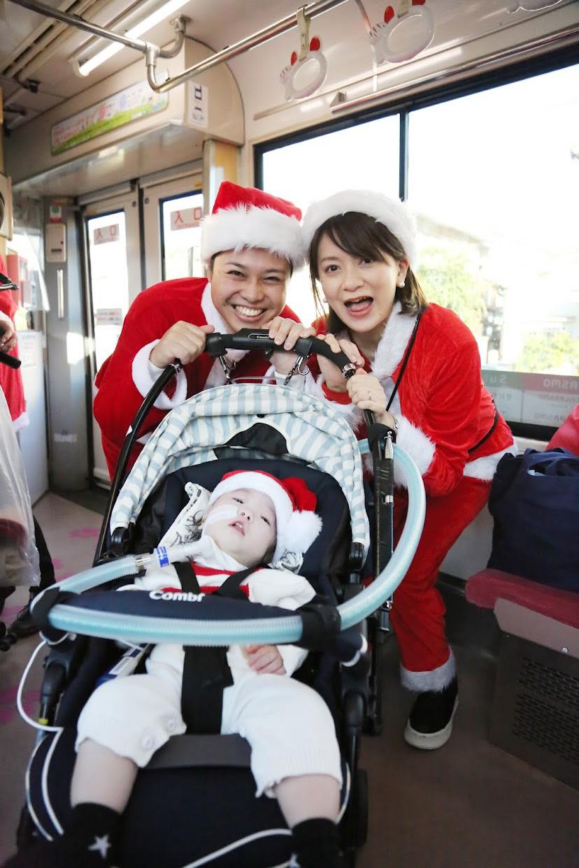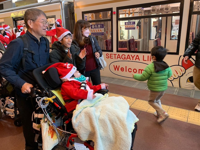 Ohanaの子どもたちは、医療機器や、それを搭載するための大きな車いすに公共交通機関の利用は躊躇しがちです。でもサンタ電車なら安心。今年は呼吸器のお子さん3組も参加してくれました。
