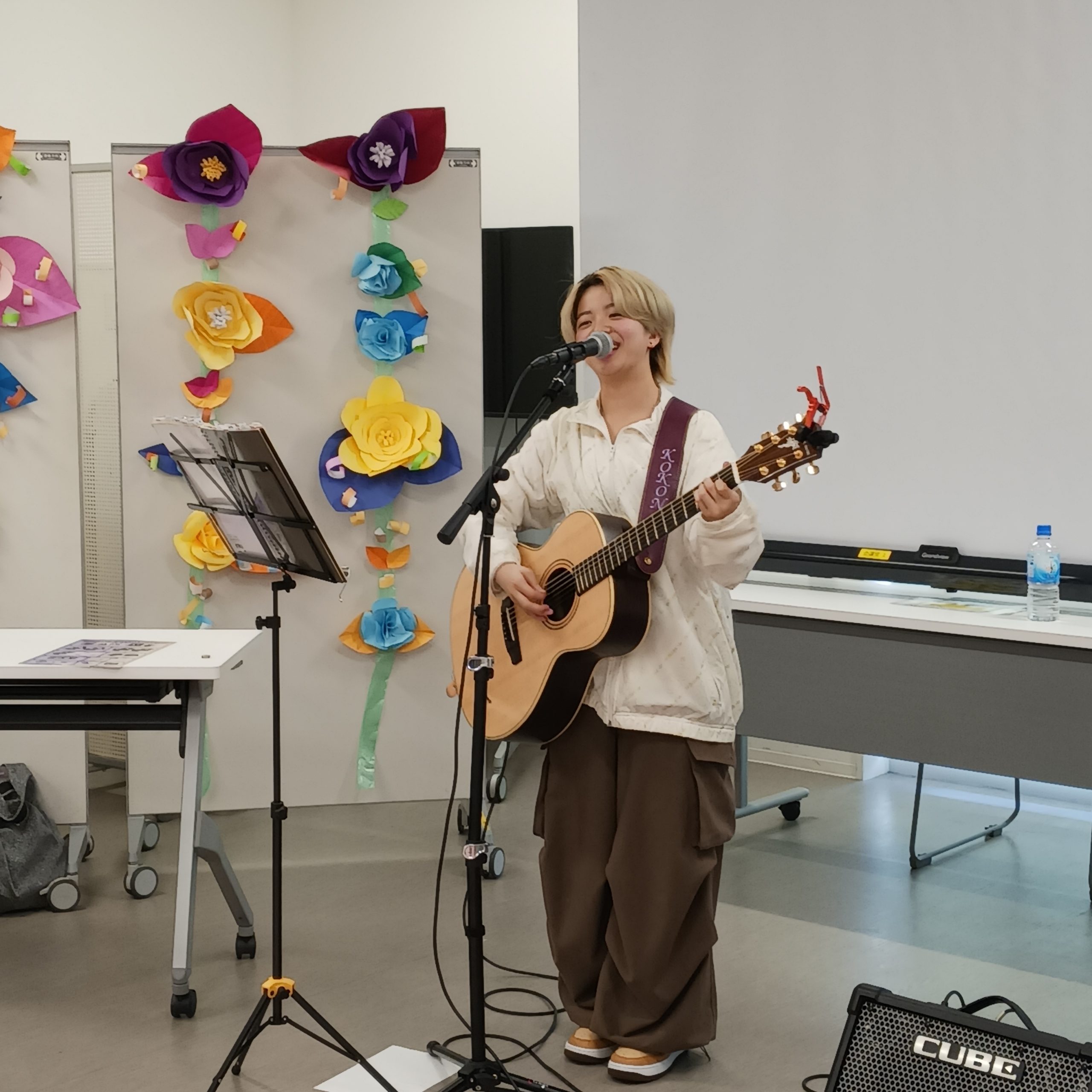 ひろばの概要とスタッフの紹介や手遊びの交流が終わると、シンガーソングライターの心愛(ここな)さんが登場!ライブ会場になりました!また、「デジリハ」IT機器を使った視線入力、タッチゲームのコーナーも登場してインクルーシブな形態で一緒に遊びました。